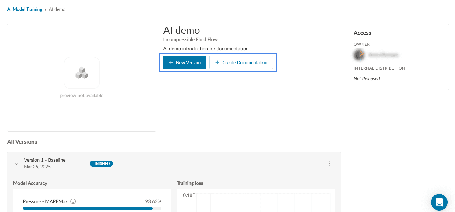 If you are not satisfied with the training or if the current version did not finish successfully a new version can be trained. Additionally, a document can be created to provide key information for the users of this AI model. These two options are depicted in Figure 10.