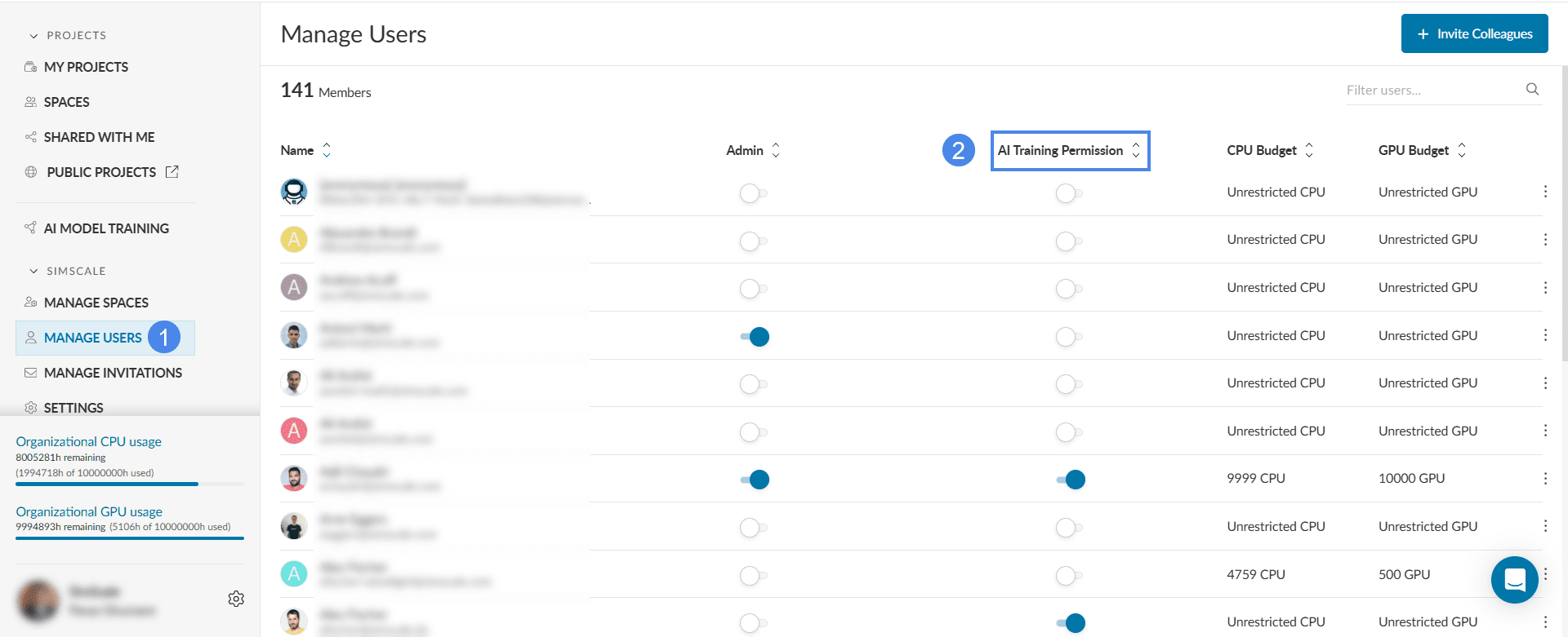 If your organization has a license for AI training then as an organization admin you can activate AI training permission for your users. This can be done by first accessing the ‘Manage users’ item on your Dashboard and then enabling the feature ‘AI training permission’ for each user individually.