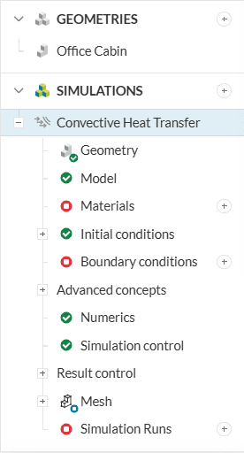 Choose the ‘Convective Heat Transfer’ type from the list and confirm your choice by clicking the ‘Create Simulation‘ button. The following simulation tree with the corresponding settings should appear: