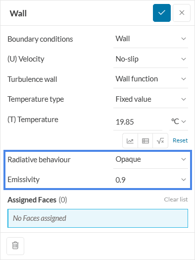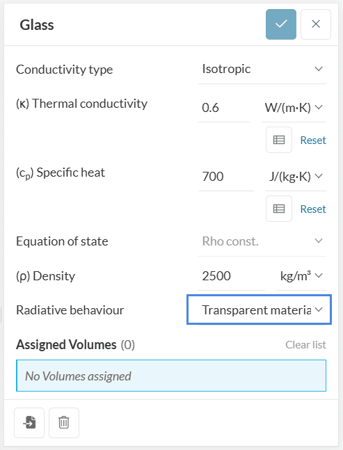 Radiative behavior specifies the relationship between the net radiative heat per unit surface area, \(Q_r\ [W/m^2]\) and the temperature of every surface, \(T_s\ [K]\). In SimScale, you can set three radiative surface behaviors, opaque, transparent and semi-transparent as well as one radiative volume behavior which is fully transparent in material assignments: