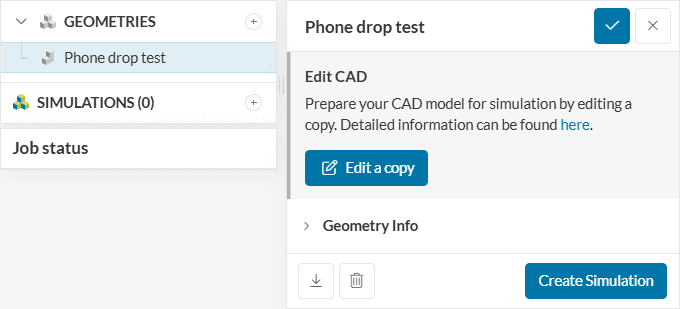 The geometry tab contains the CAD model used for the simulation. Details of CAD handling are described in the pre-processing section. For more information on the CAD upload process and the subsequent steps please read our standard documentation.