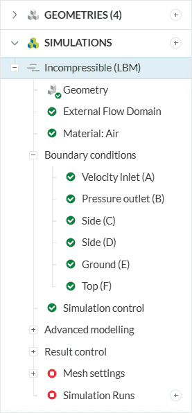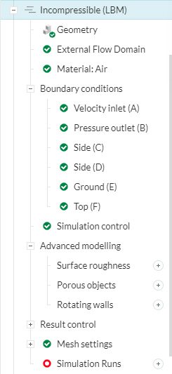 Choose ‘Incompressible (LBM)’ analysis type and click on ‘Create Simulation’. This will lead to the Workbench with the following simulation tree and the respective settings:
