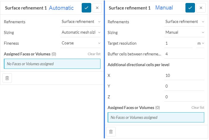 The sizing for the region of interest is managed either automatically by choosing a fineness between very coarse and very fine or by manually setting a target resolution. The parameter Target resolution defines the length scale to which the entire assigned region will be refined.