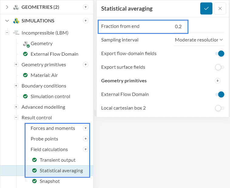 The Result Control section allows users to define additional simulation result outputs. It controls how the results will be written meaning the write frequency, location, statistics of the output data, etc.