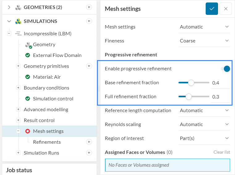 The progressive refinement option for LBM simulations allows users to greatly speed up their simulations (usually by 35-45%) while reducing the consumption of computational quota and without significant impact in the results.