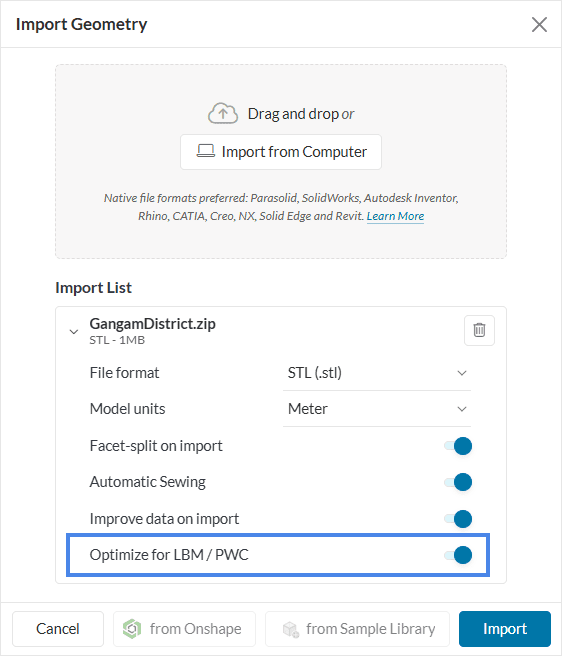 While uploading your CAD model for LBM or wind comfort simulations it is recommended to toggle on ‘Optimize for LBM / PWC’.