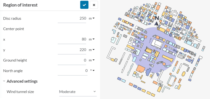 The Region of interest is a very important stage of simulation setup. The core functionality of the region of interest is to define the area around the main building/area on which the pedestrian comfort should be evaluated. Additionally, it is used as a reference to automatically size and orient the virtual wind tunnel.