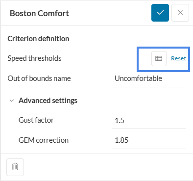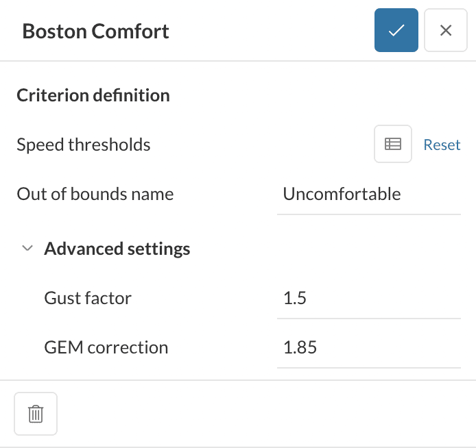 The gust factor, with a symbol in our documentation page as k_g, is an empirically derived parameter obtained through experiment. We use 3.5 in our default calculation of GEM, but if a comfort criterion specifies another, then the user is advised to change this constant in the advanced settings.