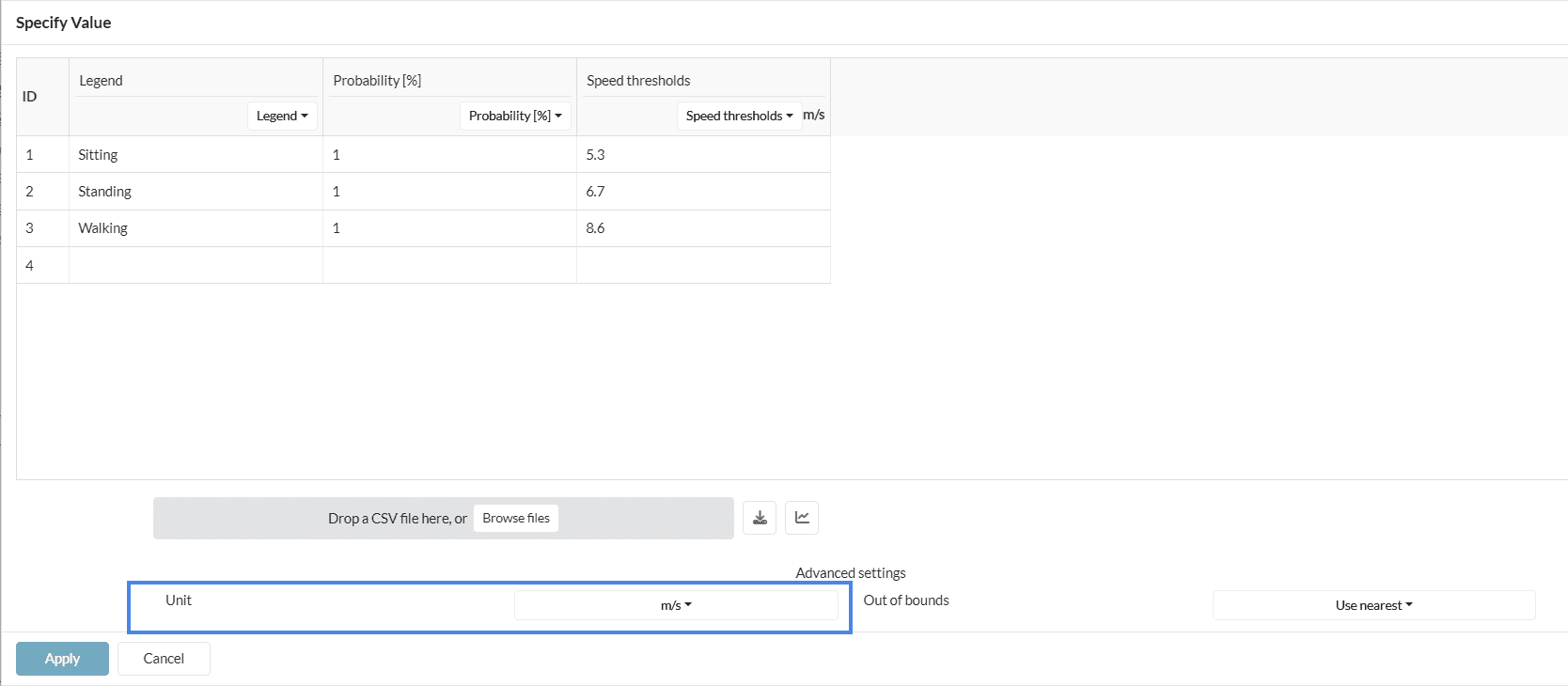 Upload or define a table containing columns for Legend, Probability or frequency, and Speed thresholds. Click on the table icon as shown in Figure 3.