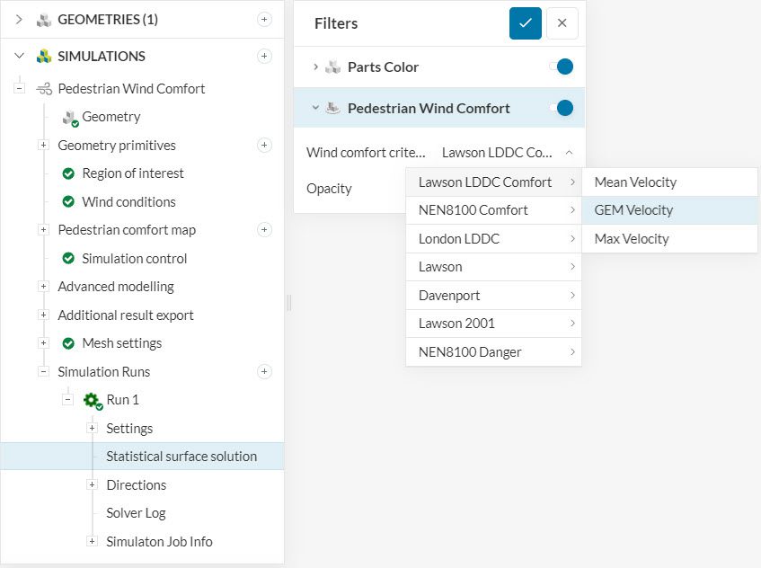 As far as simulation setup goes, there are no additional steps required to obtain wind comfort results based on GEM. The data is available for all new Pacefish®\(^1\) Pedestrian Wind Comfort (PWC) simulations by default. The image below shows the available options in the post-processing environment:
