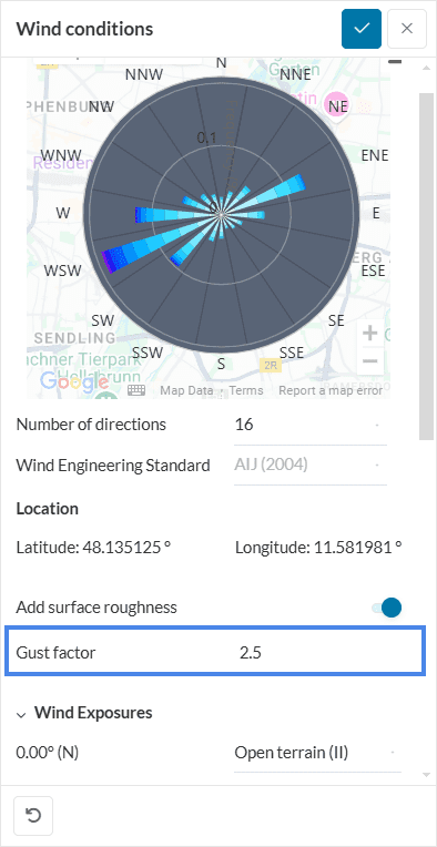From the CFD analysis we get the first part \(\frac{u_{loc}}{u_0}\) directly. On the other hand, the correction of the weather data \(\frac{u_0}{u_{120}}\) , requires some additional effort.