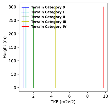 The following plots illustrate how the velocity, TKE, and specific dissipation rate looks like for each of the terrain categories of the AS/NZS defined above: