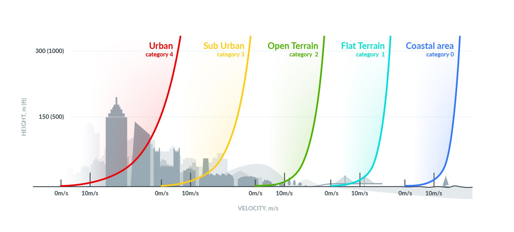 | Description | Flat (I, \(\alpha\) = 0.1) | Open (II, \(\alpha\) = 0.15) | Suburban (III, \(\alpha\) = 0.2) | Urban (IV, \(\alpha\) = 0.27) | City Center (V, \(\alpha\) = 0.35) |