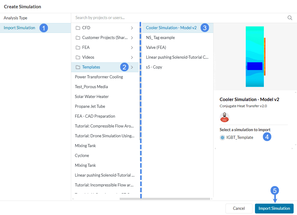 Inside the Create Simulation window click on the ‘Import Simulation’ feature. This allows you to select a simulation from another previously created project instead of selecting an analysis type. Access to the simulation to be imported can be done through multiple layers, meaning first you access folders, then the projects within the folders, and then the simulations within the projects.