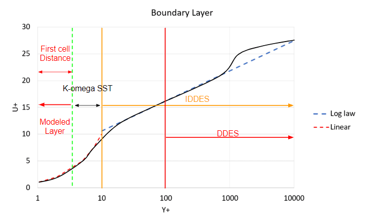 The DES models ‘K-omega SST DDES’ and ‘K-omega SST IDDES’ have similar wall requirements to the uRANS ‘K-omega SST’ since the wall model is based upon the same model however, at some point the near-wall region transitions from K-omega SST to LES.