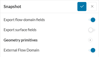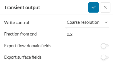 With this result control item, transient results can be saved for a given part of the simulation run, for a given output frequency, for a desired region within the fluid domain. The settings panel looks as follows: