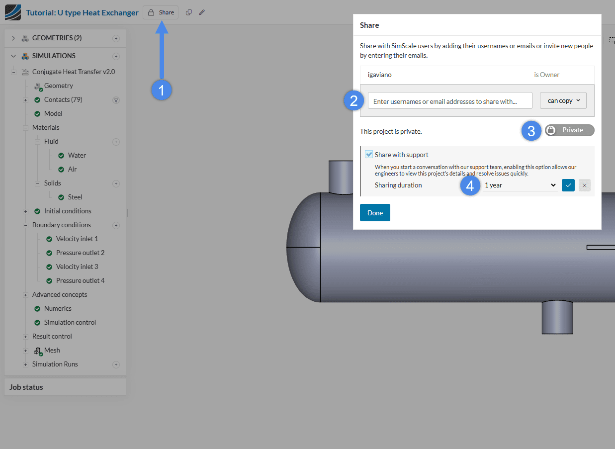 One of the major advantages of a web-based simulation platform is the ability for project sharing and live collaboration. Close team collaboration and the sharing of results and insights are important to realize the value simulation brings to the engineering design process. Currently, SimScale offers collaboration with different options to share projects with other users, within or outside an organization, and also with the SimScale Support team. Find out more below.