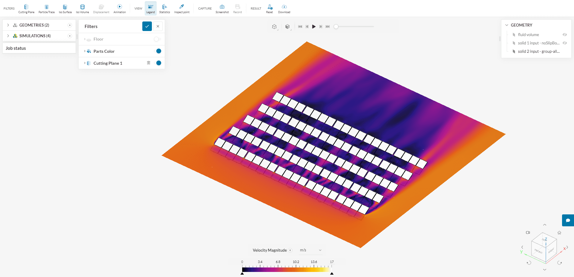 Figure 5: External aerodynamics simulation of solar panels being visualized in SimScale’s online post-processor