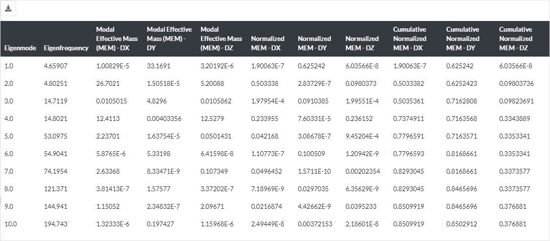 Figure 4: Statistical data table for frequency analysis. Notice the download button at the top left.