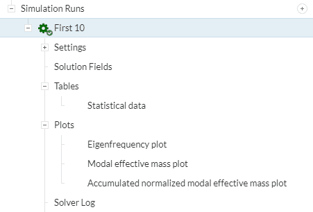 The result data from a simulation can be accessed by expanding the tree item for the simulation run. The available data differs from case to case and depends on the type of simulation and the specified result control items. Here is an example tree: