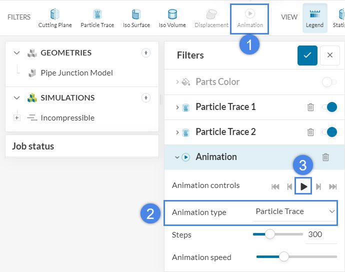 After setting the Animation type to Particle Trace, we can simply click on the ‘Play’ button, to generate an animation of the streamlines. Note that you can change the number of Steps, to control the number of frames of the animation.