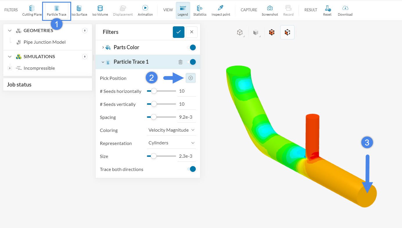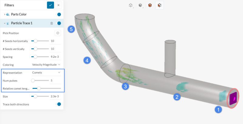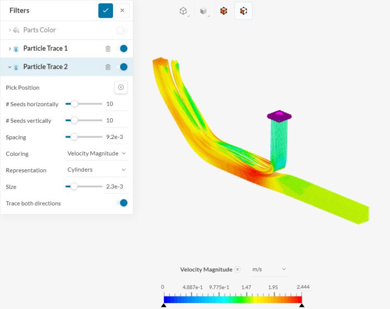 A Particle trace filter generates streamlines from a seed face. They can be useful to observe recirculation spots and flow patterns, allowing us to improve the designs.