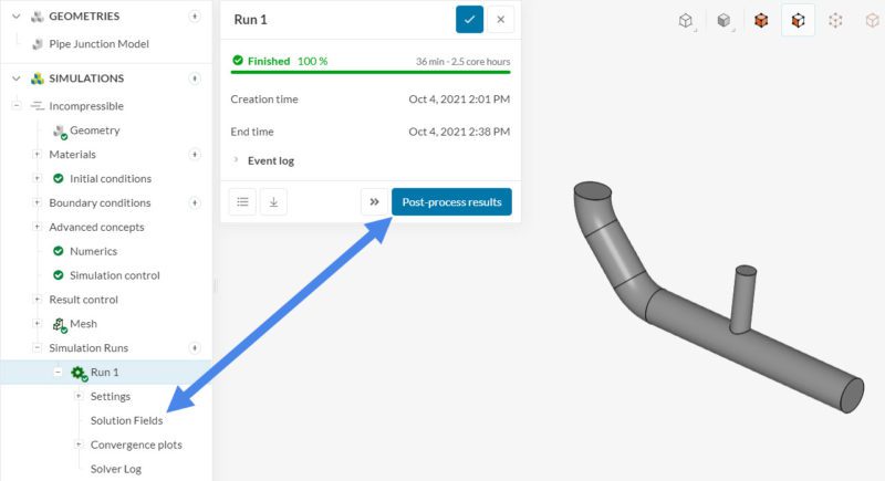 Firstly, when a simulation is successful or has results available, the run dialog box will prompt a ‘Post-process results’ button. Clicking this button or selecting ‘Solution Fields’ in the simulation tree will open the results in the online post-processor.