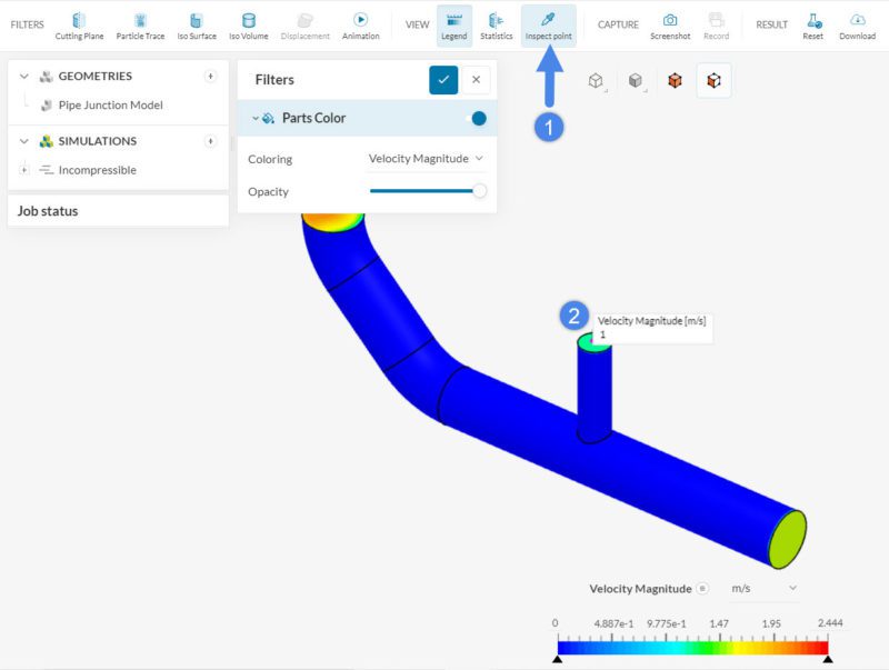 The Inspect point feature is useful to obtain an accurate read on a specific point of the surface. For example, to inspect the velocity magnitude on the top inlet: