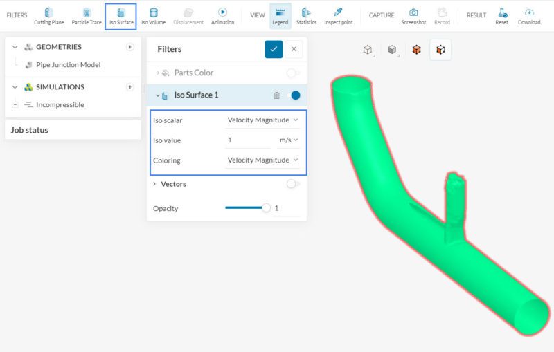 The Iso surface filter is useful to show cells that match a given variable value. For example, to see where the velocity magnitude is exactly 1 \(m/s\) an Iso surface filter, with the following configuration can be created: