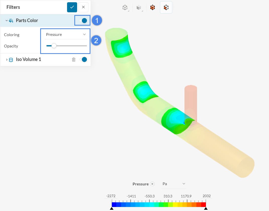 Within Iso scalar and Iso value, the user decides the criteria for highlighting the cells. With Coloring, you can choose a parameter color for the cells that satisfy the criteria.