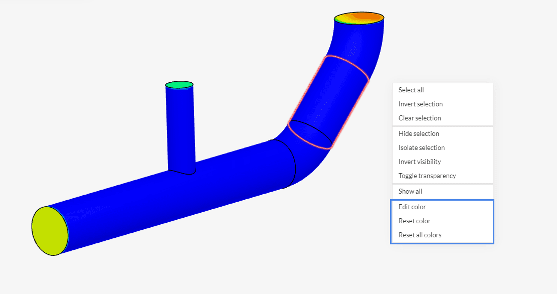 Depending on the active selection mode, single or multiple faces or volumes can be colored. After the selection of faces or volumes, right-click in the viewer to open the selection panel. At the end of the options list, the following color features are listed: