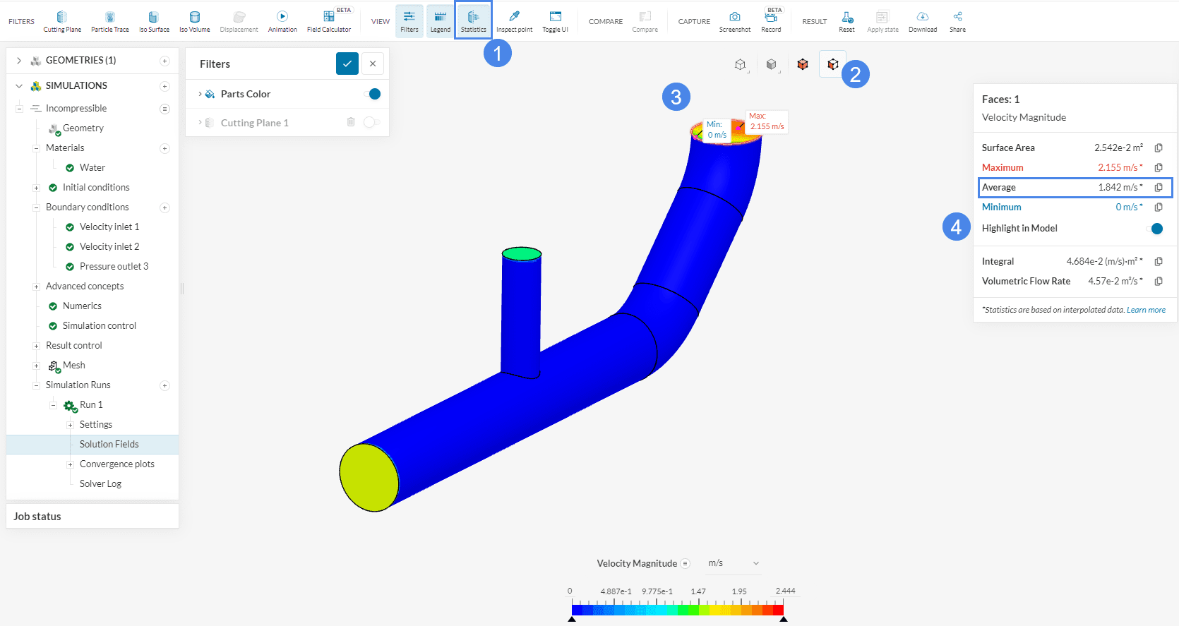 Note that the information displayed by the statistics filter is dynamic. You can select various faces and also change the parameter that is being analyzed. To make the information box disappear, you can toggle Statistics off.