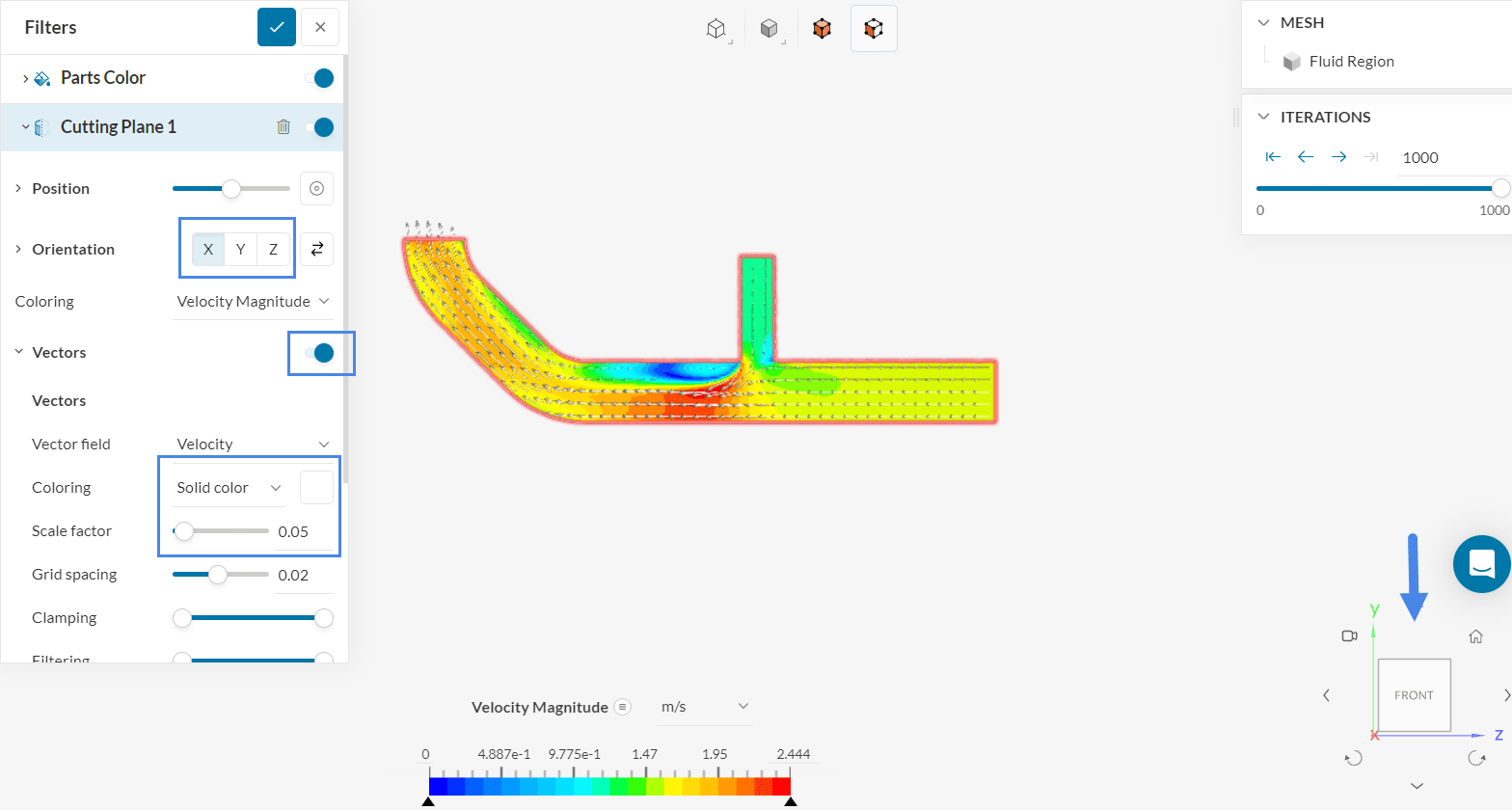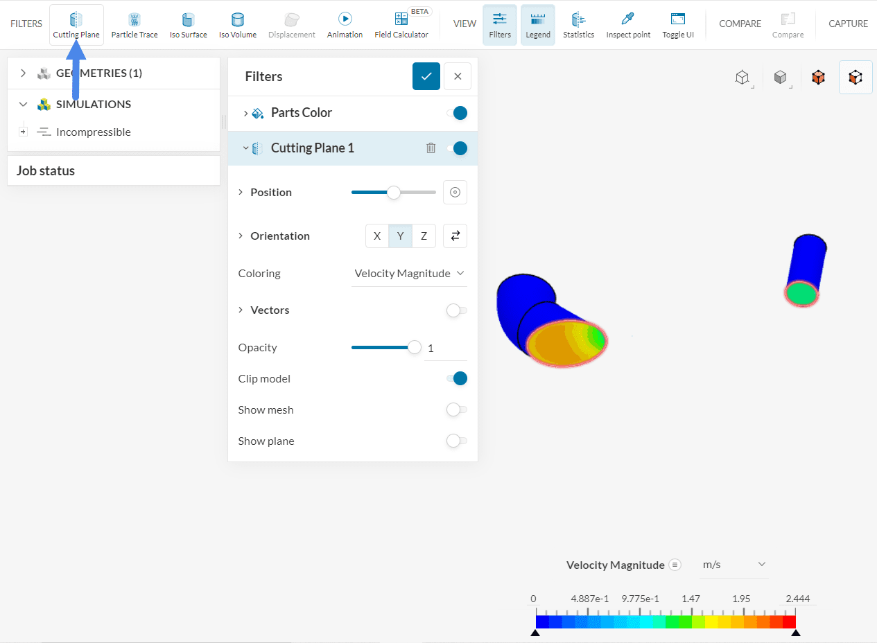 With a Cutting plane filter, you can slice the domain and visualize parameters of interest on the plane. Additional options, such as plotting velocity vectors, are also available.
