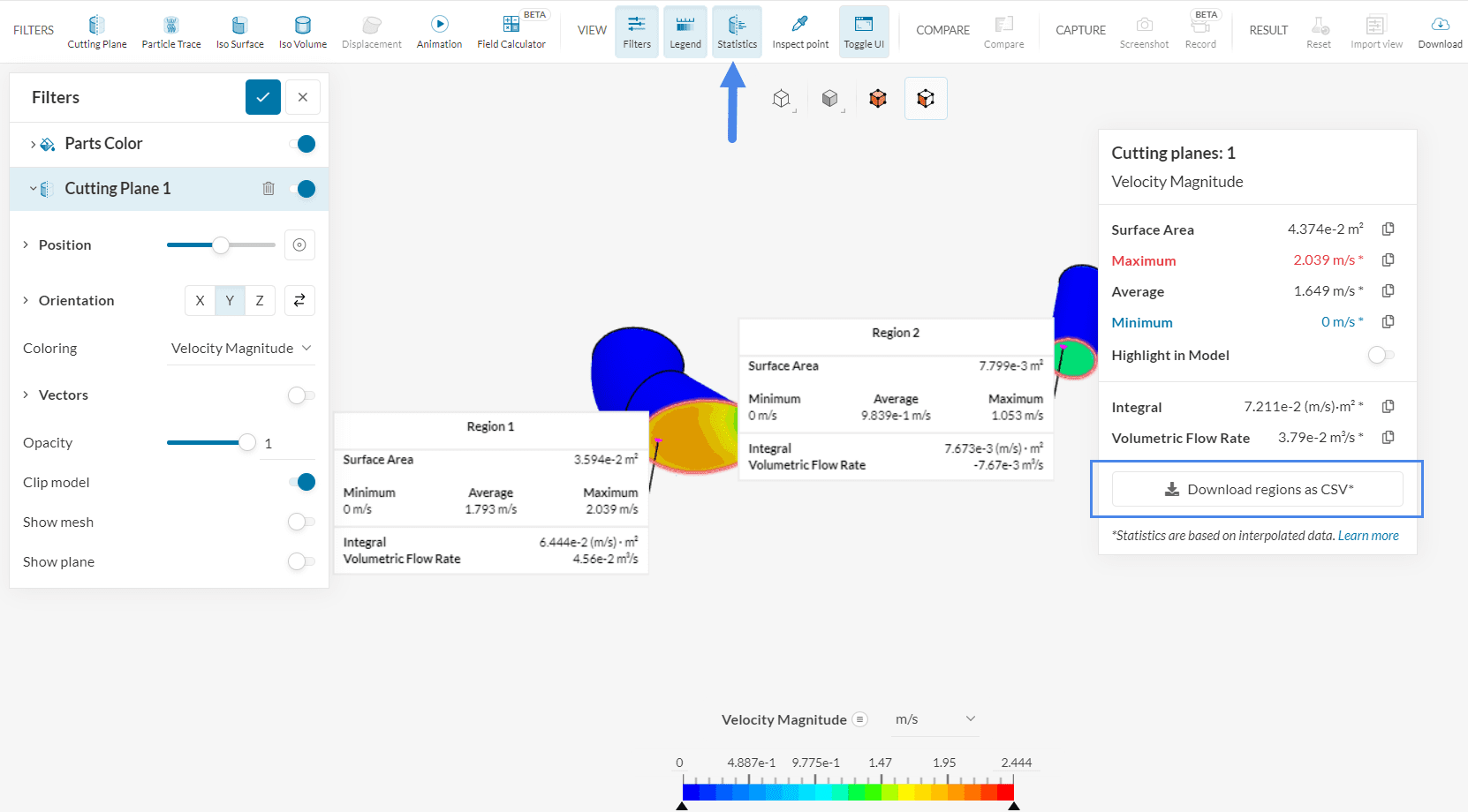 It is possible to use cutting planes in combination with the Statistics tool. When enabled, statistics will show average, minimum, and maximum results on the entire cutting plane and each sub-region. For example, in the image above the cutting plane generates 2 sub-regions when splitting the domain. After enabling statistics, we see the following: