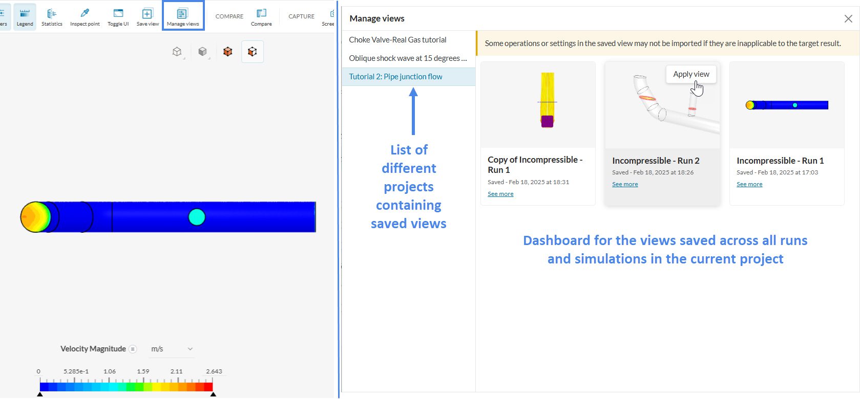 Much like the Compare feature, Import view is only available in projects with more than one simulation. With import view, you can copy the post-processing state from another simulation to the current post-processor instance: