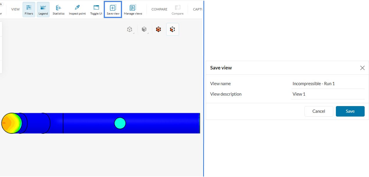 Simulating a project and drafting a professional report might require recreating the same angles and screenshots for all the visual results. To take advantage of this consistency in your animations and images use the Save view filter where you can save and manage views across different simulation runs within the same project as well as across different projects.