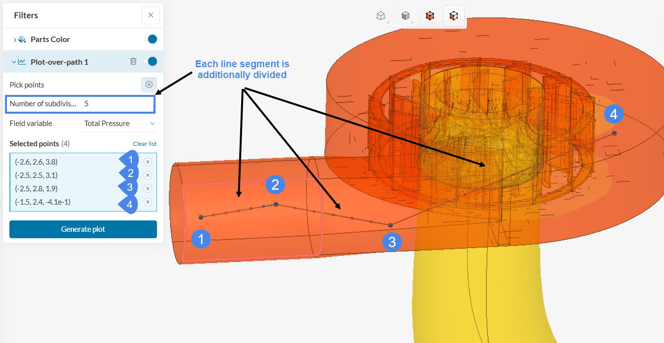 The Plot-over-path filter helps visualize how simulation quantities vary over a desired path within the simulation domain. This path is created using sample points added by the user.