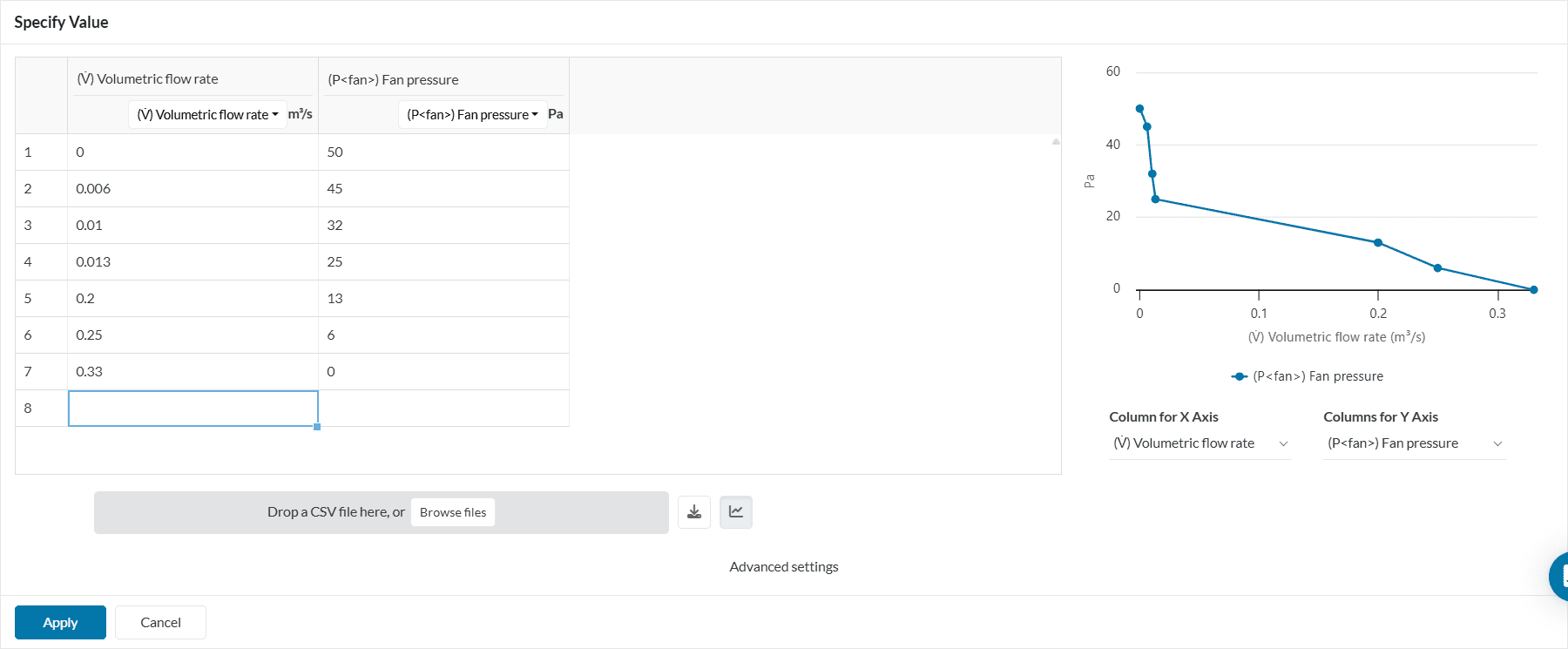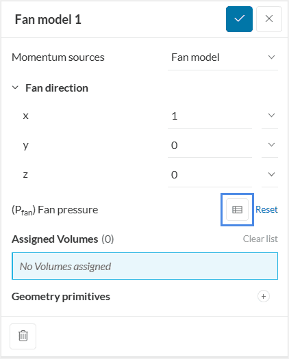 Within the fan model configuration window, the user needs to define the Fan direction based on the global coordinates, and also the Fan pressure via table input.