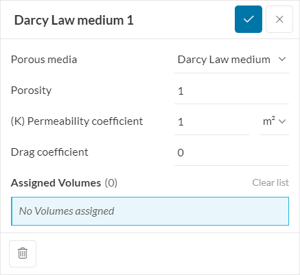 The Darcy Law medium is another porous media model exclusive to the multi-purpose solver. With the current implementation, this porous media model is always isotropic.