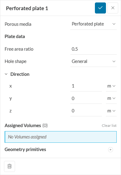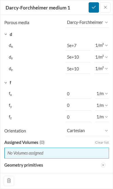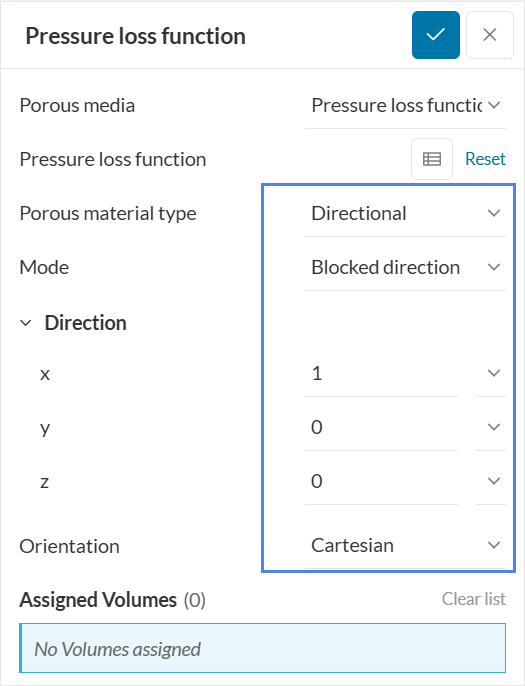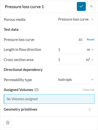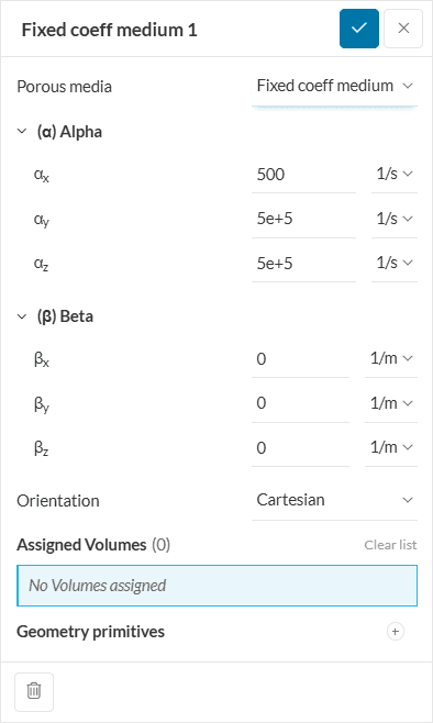 Note that this porous media model is always isotropic and the volume assignment needs to be done to a CAD volume since geometry primitives are not supported.