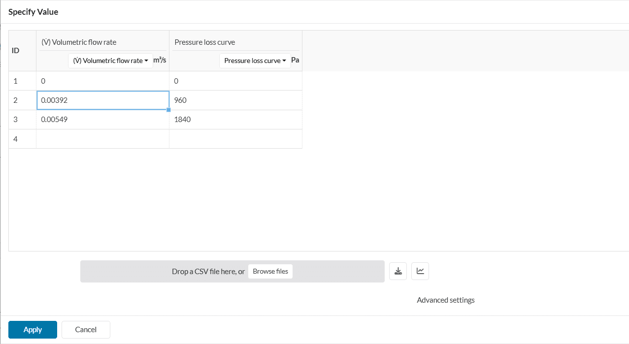 The pressure loss function porous media is exclusive to the multi-purpose solver. Similarly to the pressure loss curve model, the user defines a volumetric flow rate versus delta pressure table by clicking on the table button: