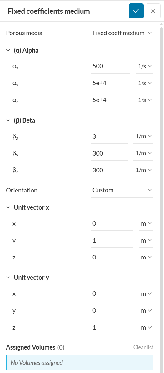 Similarly to the Darcy-Forchheimer model, the user has to specify two unit vectors for a local coordinate system. The \(\alpha\) and \(\beta\) coefficients are input based separately for each direction. Therefore, a fixed coefficients medium can be used to define isotropic and non-isotropic porosity.