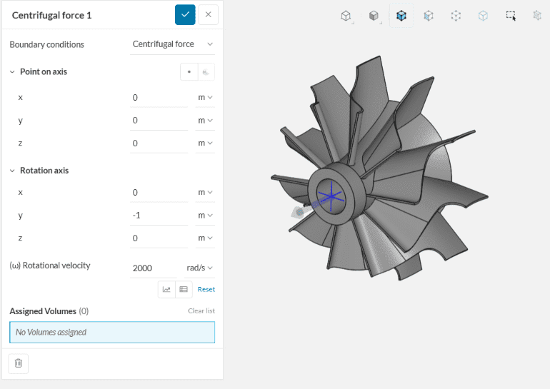 This boundary condition is used to apply the forces that act on a structure when it rotates around a fixed axis. It is particularly useful in turbomachinery applications, such as solid mechanics analysis of impellers.
