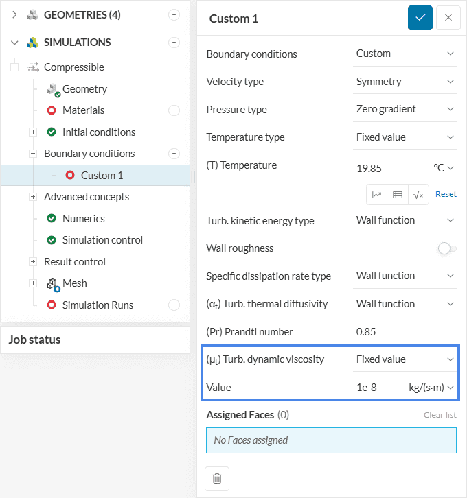 SimScale allows its users to define dynamic turbulent viscosity \((\mu_{t}\)) or \((\mu_{sgs}\)) in units of \([\frac{kg}{ms}]\) as an initial condition and also as part of custom boundary condition.