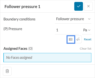 This boundary condition results in a distributed load, normal to the assigned entities. Figure 1 shows the setup window for this boundary condition. By clicking on the highlighted button, it’s also possible to define the (P) Pressure value via a table or formula input: