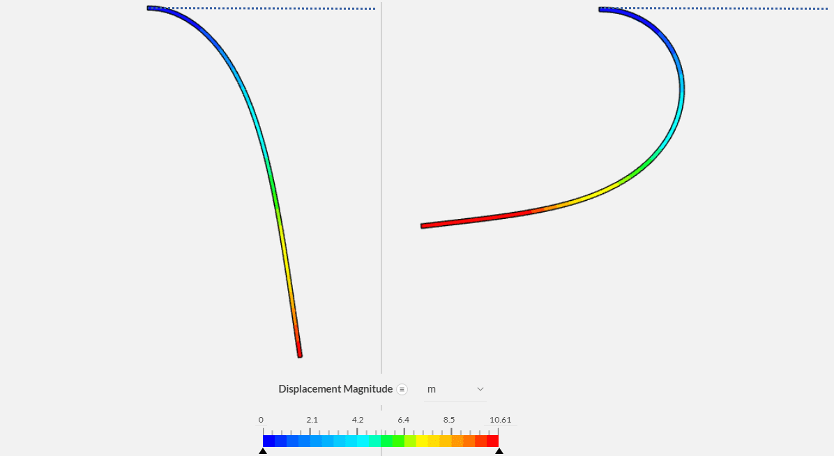 Once again, the dotted line indicates the initial beam position. The resulting displacement is very different from the follower pressure boundary condition since the pressure boundary condition won’t dynamically adapt to the beam’s deformations.