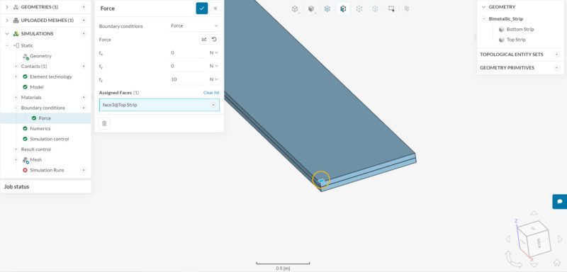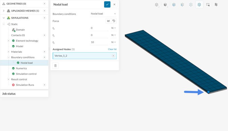 With the nodal load boundary condition, a vectorial force is applied on all nodes of a geometrical entity (nodes, edges, or surfaces). Currently, the following analysis types support nodal loads: