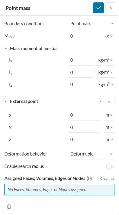 With the Point mass boundary condition, a remotely concentrated mass and inertia can be created and connected to specific faces.
