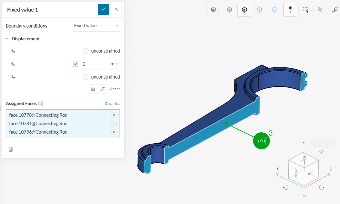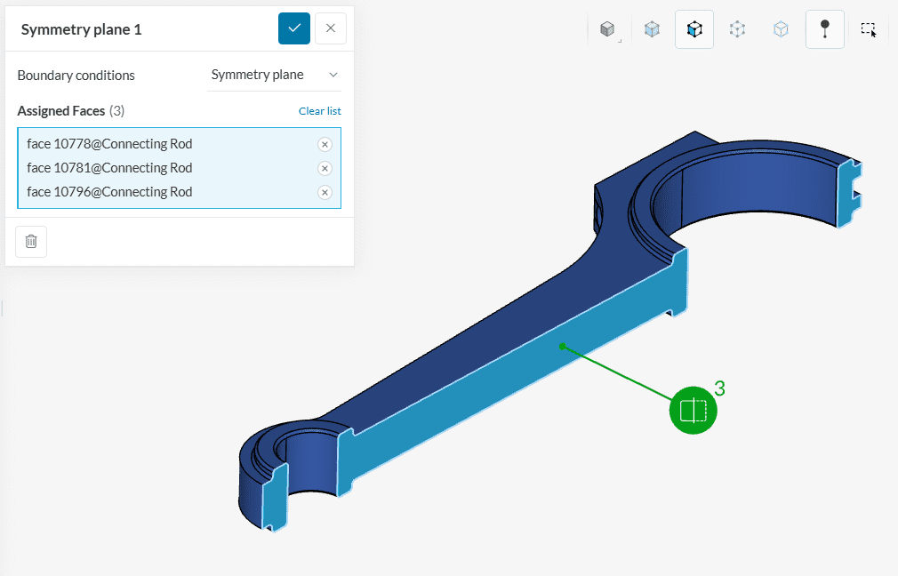 It can be applied to faces of a structure and no other user input is needed. If a symmetry plane condition is applied to a face, the displacement of this face is locked in a normal direction but free to slide in tangential directions.