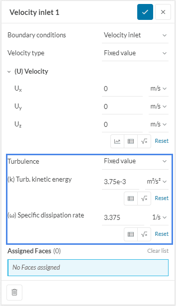 Fixed Value allows the user to directly specify the turbulent kinetic energy \([\frac{m^2}{s^2}]\) and the specific dissipation rate \([\frac{1}{s}]\).